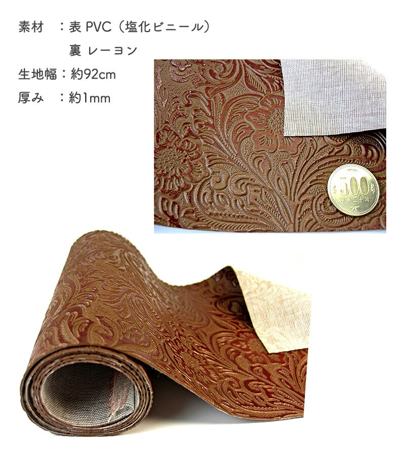 商品名 : 合皮生地クラフト型押No,1(0120)【メール便不可】|50cm単位販売 切り売り フェイクレザー レザー 合皮 合成皮革 PVC バッグ 花柄 型押し おしゃれ フラワー エンボス 生地 エンボス加工 唐草 花唐草 ポーチ 財布 バッグ 持ち手 キーホルダー レトロ アンティーク